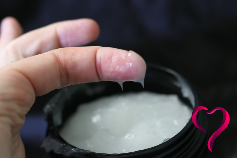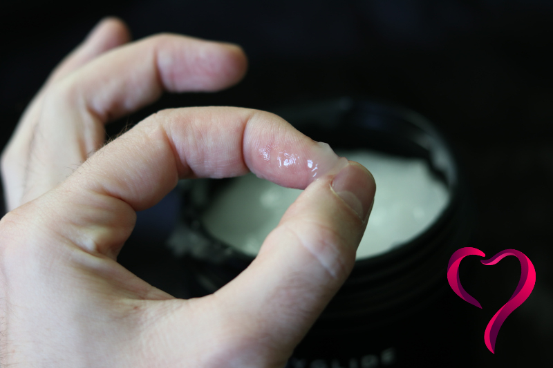 Je to nejhustší gel, co jsem měl v ruce. Není gumový, není lepidlový, prostě poctivě hutný. Když ho naberu na prst nebo nanesu na dildo, udrží tvar a teprve pak se pomalu rozprostře. A když začnu přirážet, změní se ve skluz jak blbec – přesně tak, jak má.