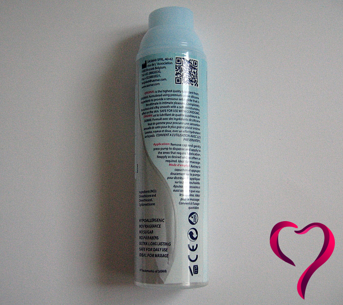 Jediný zástupce silikonových gelů u Sasmaru, je bezpečný s kondomy, neobsahuje oleje, parabeny ani jiné škodlivé alergické složky.