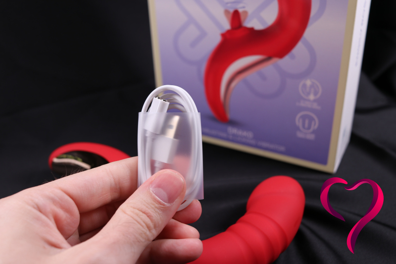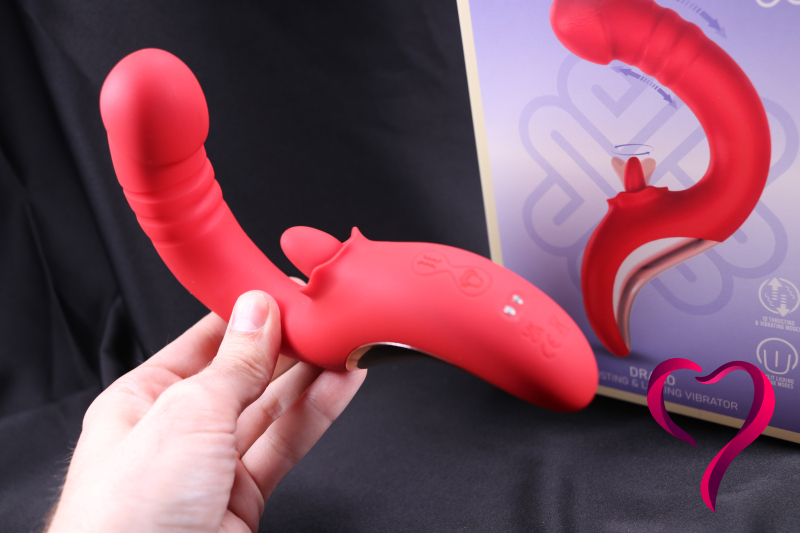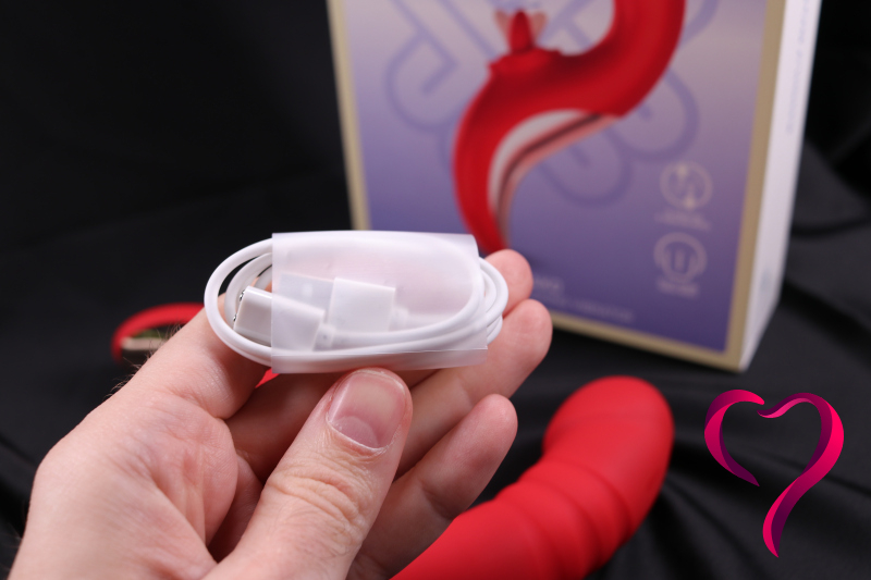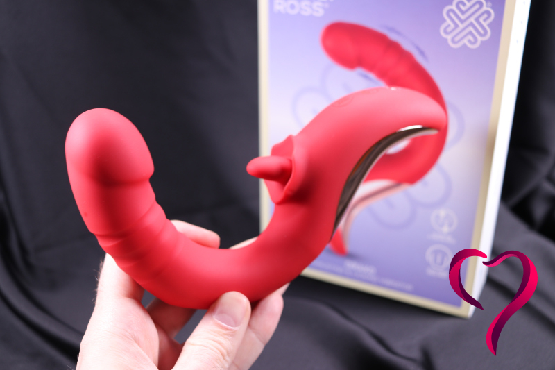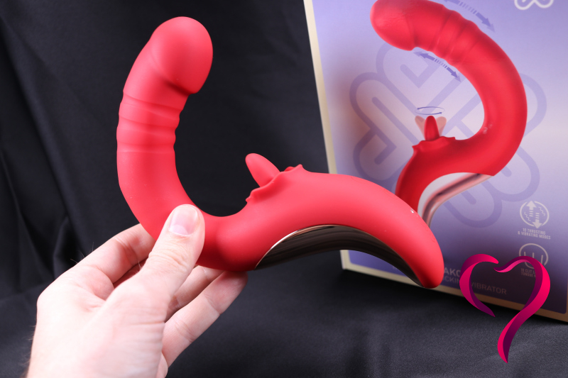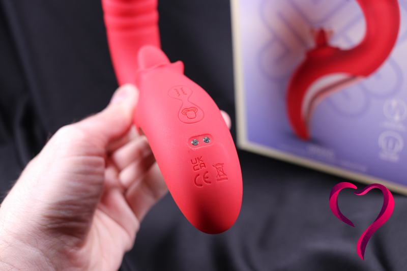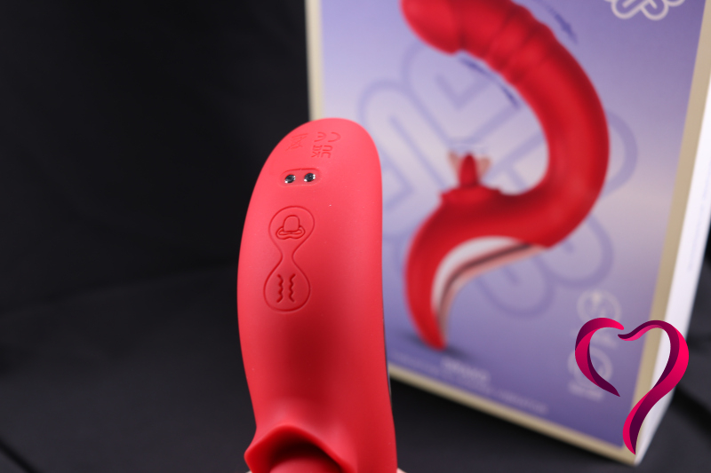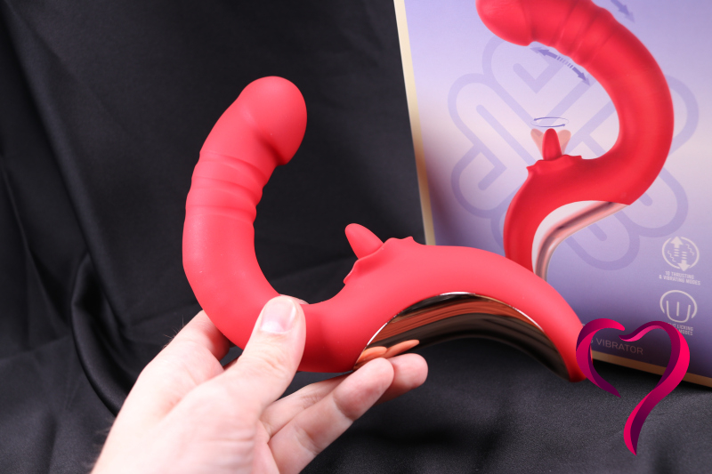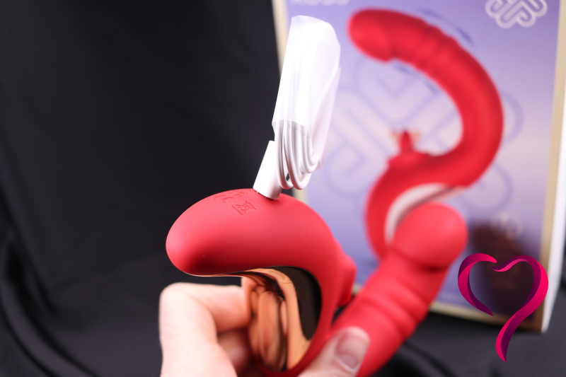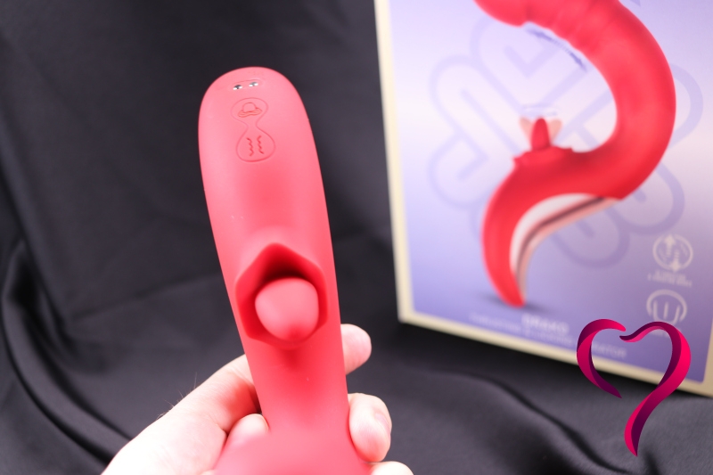 Kromě této hlavní části, která umí vibrovat a přirážet, je hračka vybavena ještě jazýčkem v úrovni klitorisu. A ten se opravdu nepovedl. Je tvrdý, tuhý, nepoddajný. Není to jazýček, o kterém bych snila, aby pečoval o můj klín. Ani s velkým množstvím lubrikačního gelu. A to já masochistické sklony mám…