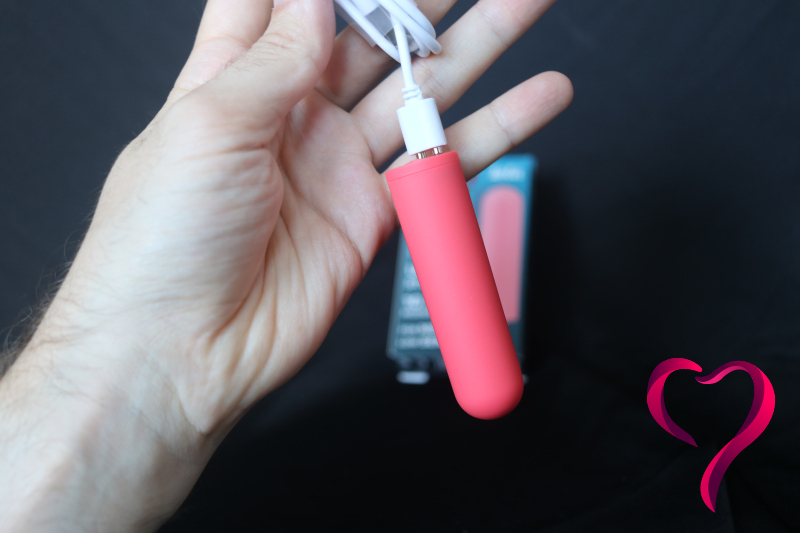 Balení Vás informuje o oranžové barvě, ve skutečnosti je zbarven do jemného růžového odstínu. Hračka je na dotek jemná a příjemná, vyrobená z ABS materiálu s vodotěsnou izolací IPX7. Nabíjení je jednoduché a bezproblémové. V balení naleznete kabel sloužící k magentickému nabíjení, s intuitivním připojením k vibrátoru. Druhou část kabelu připojíte do USB-A nabíječky nebo přenosné nabíječky.