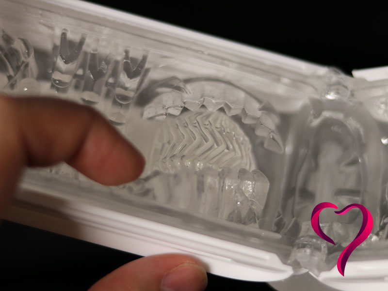 Pokud neznáte honítka od japonské Tengy, asi vás překvapí, že otvor nenapodobuje dívčí ústa, její vagínu či vilnou prdelku. A ani jejich obdoby u pánů. Je to prostě obkrouhlý otvor, za kterým ostřejší oči vidí vnitřní výstelku z průhledného silikonu. Náznaky vnitřní struktury jsou efektně vidět i z vnějšku, kde prosvítá kolem boků.