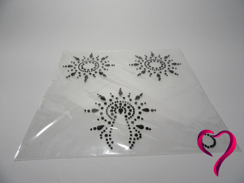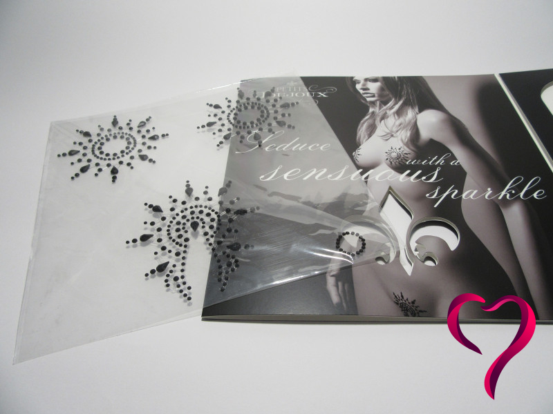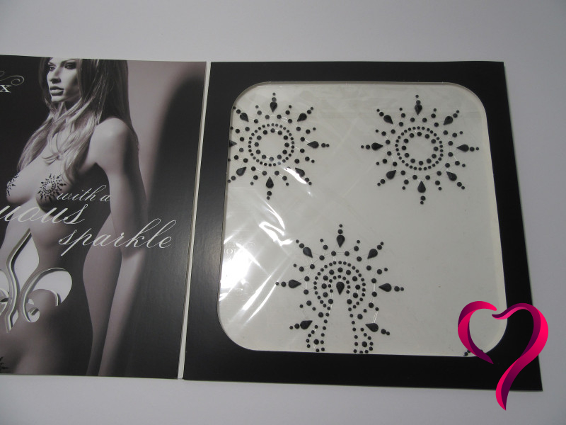Moje absolutně nejoblíbenější část jsou kousky na bradavky. Jsou černé, jemně třpytivé, a nalepené na průhledném, opakovaně lepivém podkladu, který krásně rámuje bradavky a překrývá celý dvorec.